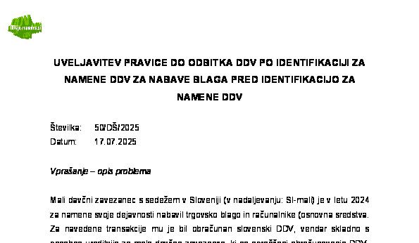 PRIDOBITEV IDENTIFIKACIJSKE ŠTEVILKE ZA DDV PRI MALEM DAVČNEM ZAVEZANCU – NAKUPI RABLJENEGA BLAGA OD OBDAVČLJIVIH PREPRODAJALCEV IZ DRUGIH DRŽAV ČLANIC EU – Ali preseganje nakupov v vrednosti 10.000 EUR pomeni obveznost za identifikacijo za DDV? 27.11.2025 27.11.2025