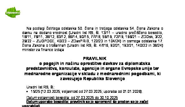 Pravilnik o pogojih in načinu oprostitve davkov za diplomatska predstavništva, konzulate, agencije in organe Evropske unije ter mednarodne organizacije v skladu z mednarodnimi pogodbami, ki zavezujejo Republiko Slovenijo 01.01.2026 03.11.2025