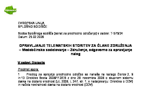 STORITVE, KI JIH OPRAVIJO NEODVISNE SKUPINE OSEB, KATERIH DEJAVNOSTI SO OPROŠČENE – STORITVE, KI SO NEPOSREDNO POTREBNE ZA OPRAVLJANJE OPROŠČENE DEJAVNOSTI – Nevarnost izkrivljanja konkurence – Storitve čiščenja v zdravstvenem in izobraževalnem sektorju (C-379/24) Agrupació de Neteja Sanitària 22.01.2026 18.02.2026