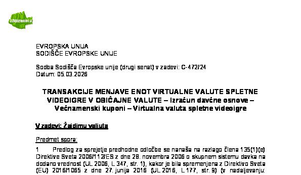 POJEM KUPON – PROGRAM ZVESTOBE STRANK V OBLIKI TOČK, DODELJENIH NA PODLAGI PREJŠNJIH NAKUPOV – Točke, ki se lahko naknadno zamenjajo za proizvode manjše vrednosti (C-436/24) Lyko Operations 05.03.2026 17.03.2026
