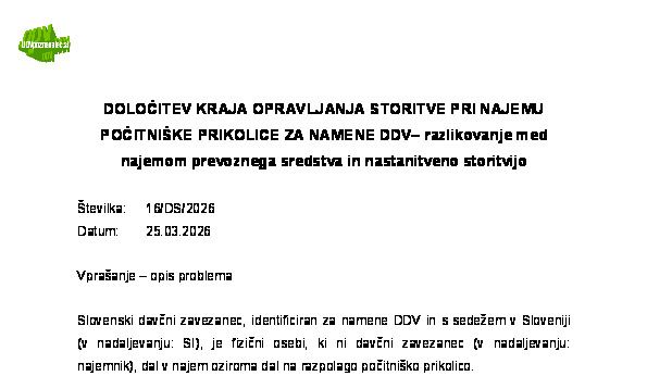 OBVEZNOST OBRAČUNA DDV OD ZASEBNE (NEPOSLOVNE) UPORABE ELEKTRIČNEGA OSEBNEGA MOTORNEGA VOZILA – PRIMER, KO DAVČNI ZAVEZANEC OB NABAVI NI UVELJAVIL PRAVICE DO ODBITKA DDV, ČEPRAV JE DO ODBITKA UPRAVIČEN (66.b ČLEN ZDDV-1) 09.03.2026 09.03.2026
