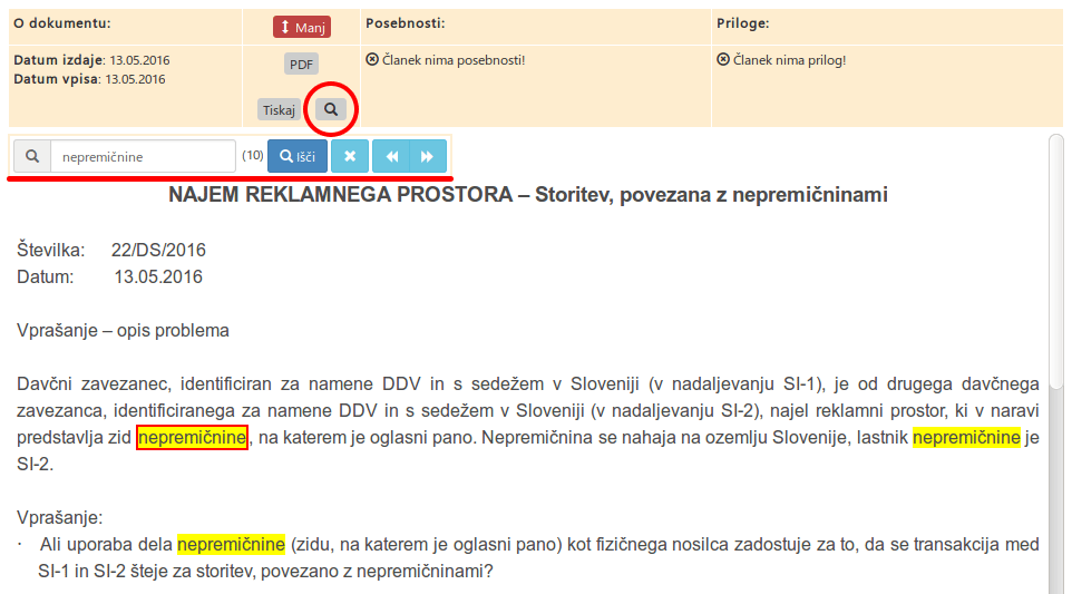 Priporočilo – če iščete določen dokument ali pa bi želeli dokument z določenega sklopa, se najprej postavite v želeni sklop (npr. če želite poiskati določeno mnenje FURS-MF – se najprej postavite oz. izberite poglavje »Mnenja FURS-MF«). |