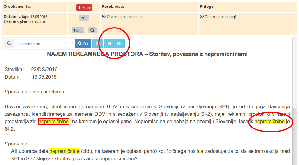 Vsi zadetki so rumeno senčeni, prvi zadetek v dokumentu pa tudi rdeče obrobljen – tj. označitev tistih delov v besedilu zadetka, ki se nanašajo na iskano besedo ali iskane besede ali iskani niz besed. Med zadetki se pomikate z izbiro naprej »>>« ali nazaj »<<«, pri čemer vam naslednji / prejšnji zadetek (oz. zadetek, ki ga trenutno prikaže) obrobi rdeče.