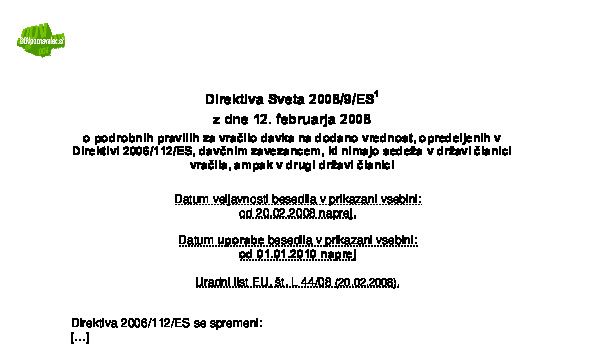 Članek nima posebnosti! Direktiva Sveta 2008/9/ES z dne 12. februarja 2008 o podrobnih pravilih za vračilo DDV, opredeljenih v Direktivi 2006/112/ES, davčnim zavezancem, ki nimajo sedeža v državi članici vračila, ampak v drugi državi članici .pdf