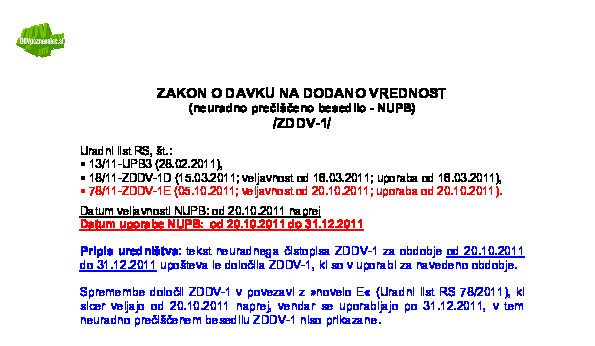| ZAKON O DAVKU NA DODANO VREDNOST (ZDDV-1 - neuradno prečiščeno besedilo) | 01.01.2025 | [!] | 10.12.2024 | |