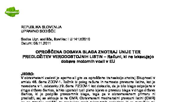 IZPOLNJEVANJE POGOJEV ZA DOBAVO BLAGA ZNOTRAJ UNIJE, OPROŠČENO PLAČILA DDV NA PODLAGI 46. ČLENA ZDDV-1 – Nepopolne CMR listine (I U 1704/2021-38) 27.11.2024 15.10.2025