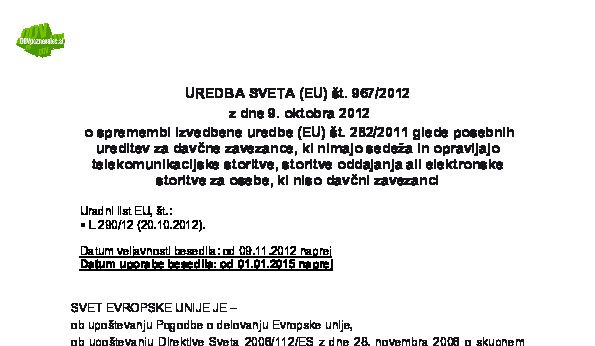 IZVEDBENA UREDBA SVETA (EU) št. 282/2011 z dne 15. marca 2011 o določitvi izvedbenih ukrepov za Direktivo 2006/112/ES o skupnem sistemu davka na dodano vrednost (neuradno prečiščeno besedilo - NUPB) 14.04.2025 02.07.2025