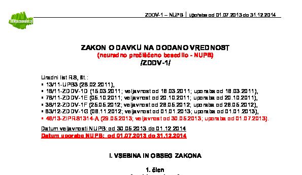 Dvig splošne in nižje DDV stopnje skladno z določili ZIPRS1314-A. Glej tudi določbe tretjega do šestega odstavka 60.a člena ZIPRS1314-A na koncu NUBP ZDDV-1 - Posebnost glede uporabe stopenj DDV za: - opravljene transakcije, katerih del je opravljen pred 1. julijem 2013, preostali del pa po tem datumu; - predplačila pred 1. julijem 2013 za dobavo blaga ali storitev, ki bo v celoti opravljena po tem datumu. |