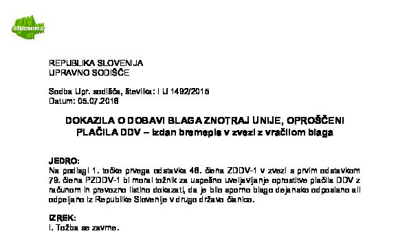IZPOLNJEVANJE POGOJEV ZA DOBAVO BLAGA ZNOTRAJ UNIJE, OPROŠČENO PLAČILA DDV NA PODLAGI 46. ČLENA ZDDV-1 – Nepopolne CMR listine (I U 1704/2021-38) 27.11.2024 15.10.2025