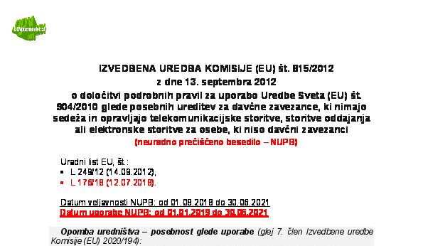 Vendar se za predložitev in popravke obračunov DDV v zvezi z opravljanjem storitev, zajetih s katero koli od obeh posebnih ureditev iz Izvedbene uredbe (EU) št. 815/2012, ki so bile opravljene pred 1. julijem 2021, navedena izvedbena uredba še naprej uporablja do 10. avgusta 2024.