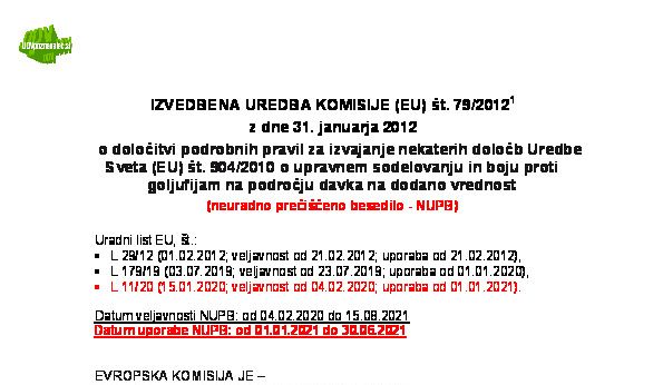 UREDBA SVETA (EU) št. 904/2010 z dne 07. oktobra 2010 o upravnem sodelovanju v boju proti goljufijam na področju DDV (neuradno prečiščeno besedilo - NUPB) 01.01.2025 21.01.2025