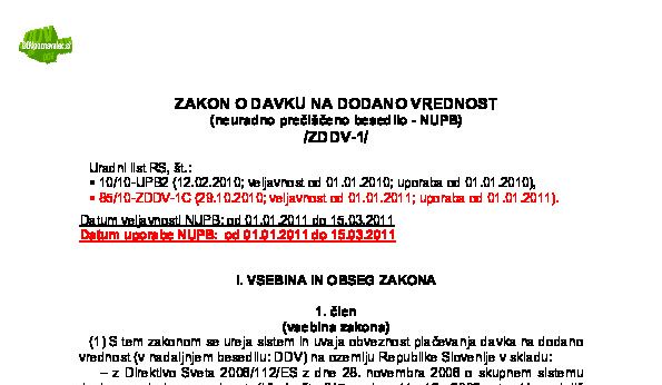 | ZAKON O DAVKU NA DODANO VREDNOST (ZDDV-1 - neuradno prečiščeno besedilo) | 01.01.2025 | [!] | 10.12.2024 | |