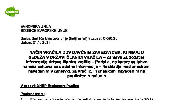 VRAČILO DDV DAVČNIM ZAVEZANCEM, KI NIMAJO SEDEŽA V DRŽAVI ČLANICI VRAČILA – GLAVNA IN POMOŽNA STORITEV – UMETNA DELITEV ENOTNE STORITVE – Neobstoj premestitve predmeta dobave (C-234/24) Brose Prievidza 23.10.2025 24.10.2025