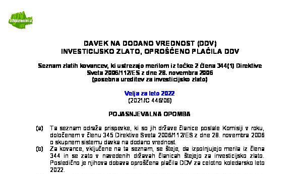 Seznam zlatih kovancev, ki ustrezajo kriterijem za investicijsko zlato (velja za leto 2025) 06.11.2024