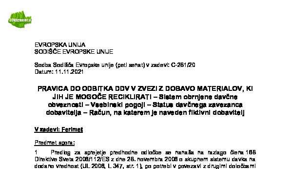 VRAČILO DDV DAVČNIM ZAVEZANCEM, KI NIMAJO SEDEŽA V DRŽAVI ČLANICI VRAČILA – GLAVNA IN POMOŽNA STORITEV – UMETNA DELITEV ENOTNE STORITVE – Neobstoj premestitve predmeta dobave (C-234/24) Brose Prievidza 23.10.2025 24.10.2025
