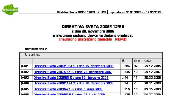 DIREKTIVA SVETA 2006/112/ES z dne 28.11.2006 o skupnem sistemu DDV (neuradno prečiščeno besedilo - NUPB) 20.03.2025 13.04.2025 30.03.2025