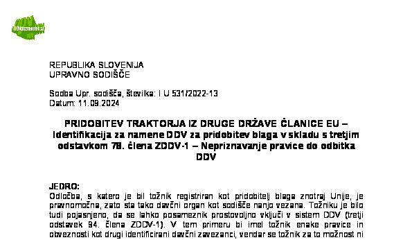 IZPOLNJEVANJE POGOJEV ZA DOBAVO BLAGA ZNOTRAJ UNIJE, OPROŠČENO PLAČILA DDV NA PODLAGI 46. ČLENA ZDDV-1 – Nepopolne CMR listine (I U 1704/2021-38) 27.11.2024 15.10.2025