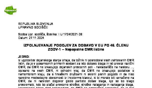 OPROSTITEV PLAČILA DDV PRI DOBAVI BLAGA ZNOTRAJ UNIJE – Dokazovanje prevoza blaga ter goljufija kupca (I U 229/2022-18) 30.09.2024 17.03.2025