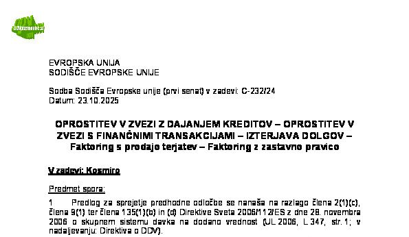 BREZPLAČNO OPRAVLJANJE STORITEV, KI SE ŠTEJE ZA OPRAVLJANJE STORITEV ZA PLAČILO – IZTERJAVA TERJATEV – Izterjava terjatve v korist tretje osebe (C-535/24) Svilosa 02.10.2025 03.10.2025