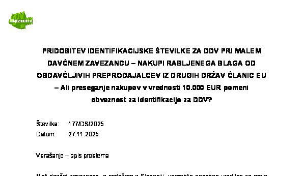 ZAHTEVA ZA PREDLOŽITEV INSTRUMENTA ZAVAROVANJA IZPOLNITVE DAVČNE OBVEZNOSTI PRED DODELITVIJO IDENTIFIKACIJSKE ŠTEVILKE ZA NAMENE DDV – Mali davčni zavezanec opravlja le storitve, za katere je plačnik DDV na podlagi 196. člena Direktive Sveta 2006/112/ES izključno davčni zavezanec iz druge države članice – prejemnik storitev 17.11.2025 17.11.2025